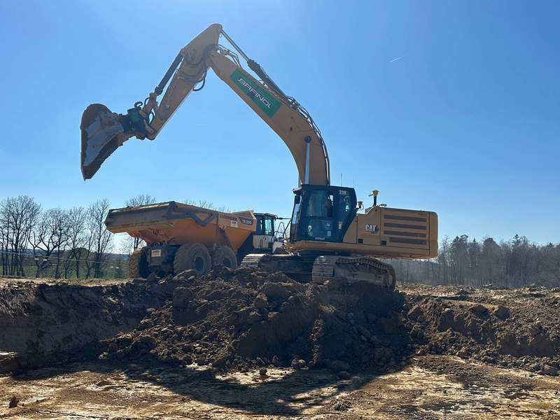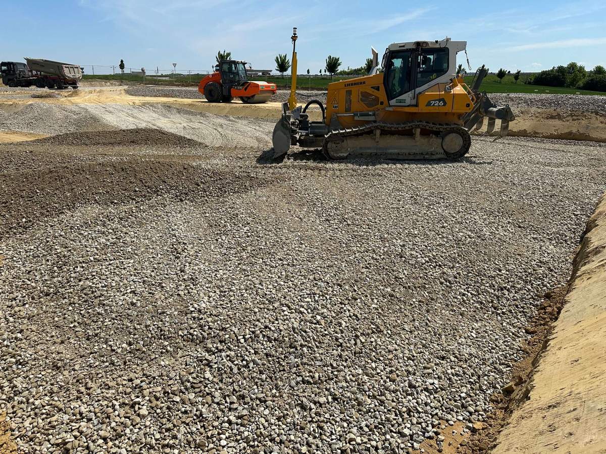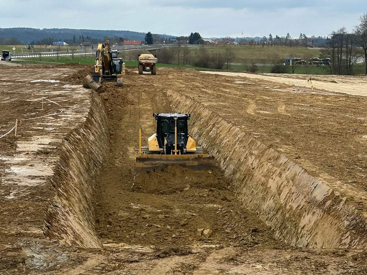 Die Urvermessung des Geländes wurde innerhalb einer halben Stunde aus der Luft mit einer Drohne vom Typ DJI Mavic 3 Enterprise ausgeführt. Nach der klassischen Vermessungsmethode ausschließlich mit dem Rover würde ein Vermesser ca. zwei Tage allein für diese Arbeit benötigen. Mit den Daten wurde ein digitales Geländemodell erzeugt, um die Massen für das Angebot zu ermitteln und es nach Auftragsvergabe für die 3D-Steuerungen der Maschinen zu nutzen. Für die präzise und schnelle Umsetzung der Planung mit Trimble Earthworks 3D-Maschinensteuerungen kamen zwei Bagger mit GNSS-Positionierung mit den neuen Trimble MS976-Empfängern sowie zwei Raupen mittels einer hochgenauen UTS-Steuerung mit der Trimble SPS930 Totalstation und dem Maschinenprisma MT900 zum Einsatz. Durch das Arbeiten mit den Maschinensteuerungen musste zur Kontrolle der Höhen nicht extra abgesteckt werden und die Maschinen konnten unterbrechungsfrei durcharbeiten. Auf Planänderungen während des Projekts konnte Brandl flexibel reagieren, die aktuellen Pläne mit dem Trimble WorksManager vom Büro aus direkt mit den Maschinen und ausführenden Mitarbeitern auf der Baustelle teilen und so Arbeiten nach veralteten Plänen vermeiden. Brandl konnte die Erdarbeiten auch aufgrund der fortschrittlichen Arbeitsweise in einem engen Zeitfenster im Dezember letzten Jahres fristgerecht fertigstellen.