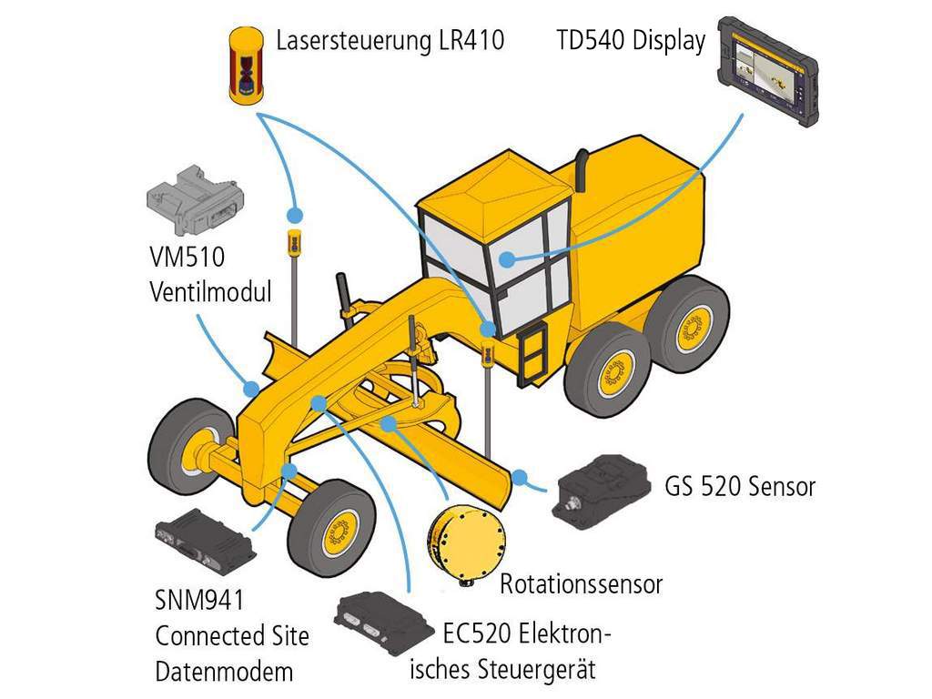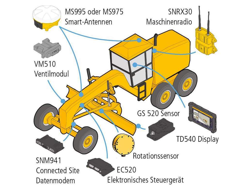Earthworks für Grader ist ein Maschinensteuerungssystem, das sehr einfach zu bedienen ist und schneller und präziser arbeitet als zuvor. Verfügbar sind 3D-Konfigurationen mit Universal-Totalstation und GNSS sowie die Laser- oder Ultraschallsteuerung für den 2D-Betrieb. Die Ausstattung mit Dual-GNSS und den neuen IMU-Sensoren erlaubt eine hohe Arbeitsgeschwindigkeit bei einer sehr hohen Genauigkeit. Alternativ ist die Positionierung mit UTS möglich. Die Vorteile dieser Variante sind die millimetergenaue Präzision für Feinplanien und das Arbeiten in Bereichen, in denen kein oder neu eingeschränkter Satellitenempfang möglich ist. Für maximale Bewegungsfreiheit an steilen Böschungen oder zur Erstellung komplexer Geländeformen wird die 3D GNSS-Steuerung von Gradern ohne Masten unterstützt. Hierzu wird ein Empfänger auf der Kabine und einer auf dem Vorbau der Maschine installiert.